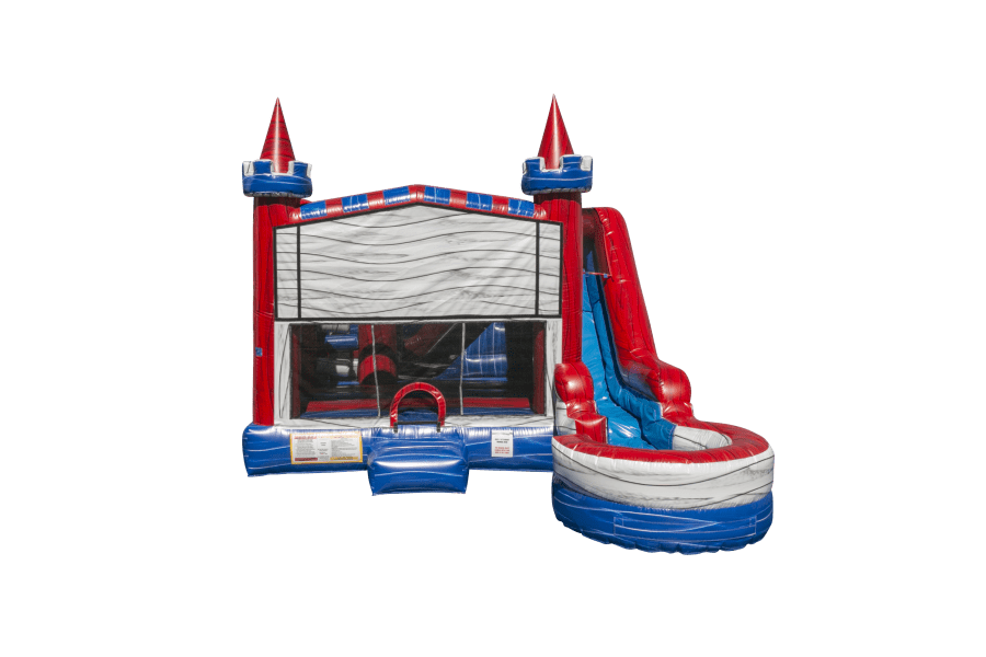 • FEATURES: Single Lane Slide, Bounce House, Climb Wall, Obstacles, 2 Basketball Hoops