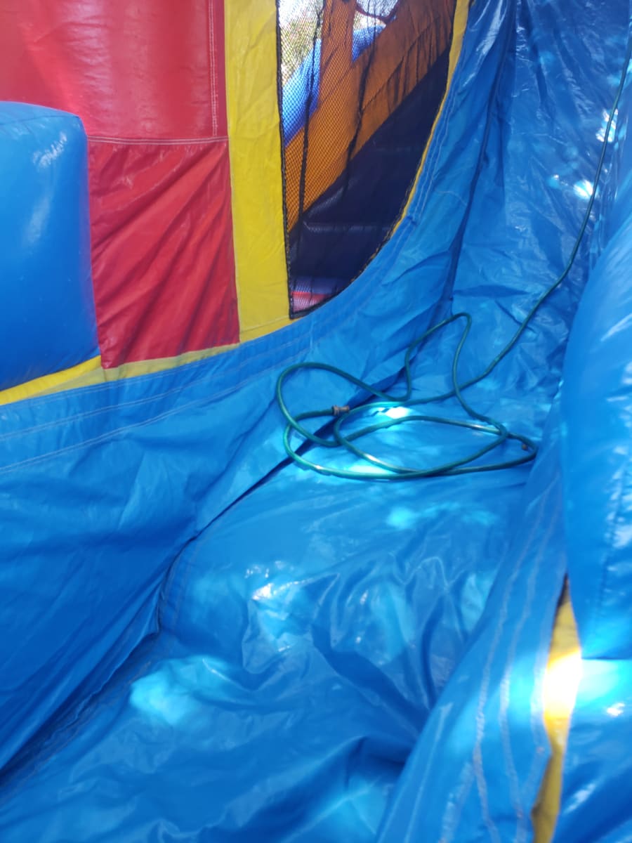 - FEATURES: Single Lane Water Slide with splash pool, jumping area, Climb Wall, Obstacles and 2 Basketball Hoops
