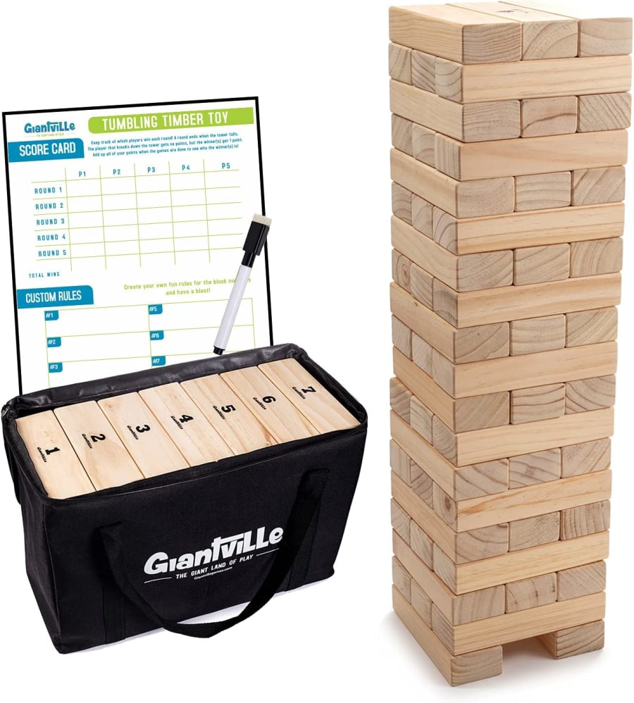 Giant Tumbling Timber Toy - Wooden Blocks Floor Game for Kids and Adults, - Grows from 2-feet to Over 4-feet