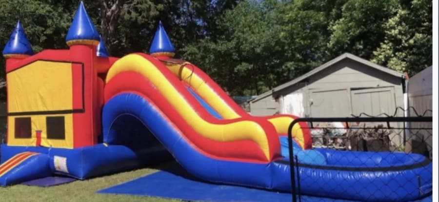 • FEATURES: Single Lane Slide, Bounce House, Climb Wall, Basketball Hoop, Tunnel and Pool